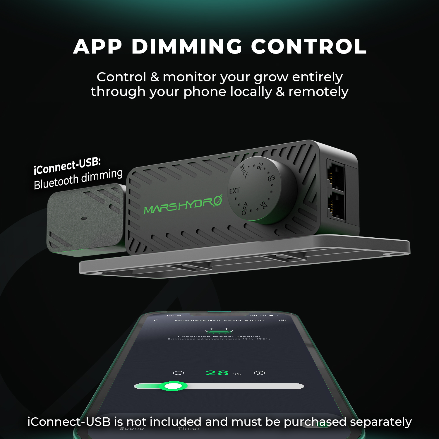 TSW2000 is one of our best-sellers as a home-use LED grow light, the perfect lighting solution for 4-8 plants. Affordable prices, intuitive yields, and available dimmer and daisy chain functions ensure scalability. Wattage - 300w Veg Coverage - 4'x4'(120cm×120cm) Flower Coverage - 3'x3'(100cm×100cm) The overwhelming choice for most growers is in grow tent, small room, cabinet & closet, and plant shelves. Update TSW2000, you can customize brightness through your phone by connecting via Bluetooth with MarsPro App Control.(Insert iConnectu into dimmer box is not include, must be purchased separately)