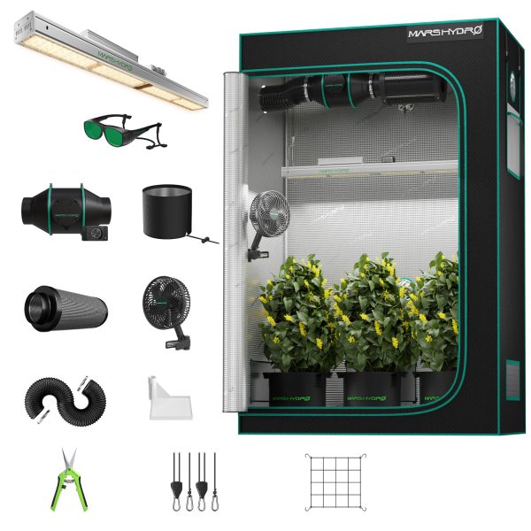 FC-E4800 LED Grow Light (480W) / 120x120x200cm Indoor Grow Tent / 6” Inline Fan / 6” Carbon Filter / 25′ Duct Tube / 6 pcs of 5 gallon Grow Bags / 4’x4′ Trellis Net / Timer / Hygrometer / 3 Duct Clamps