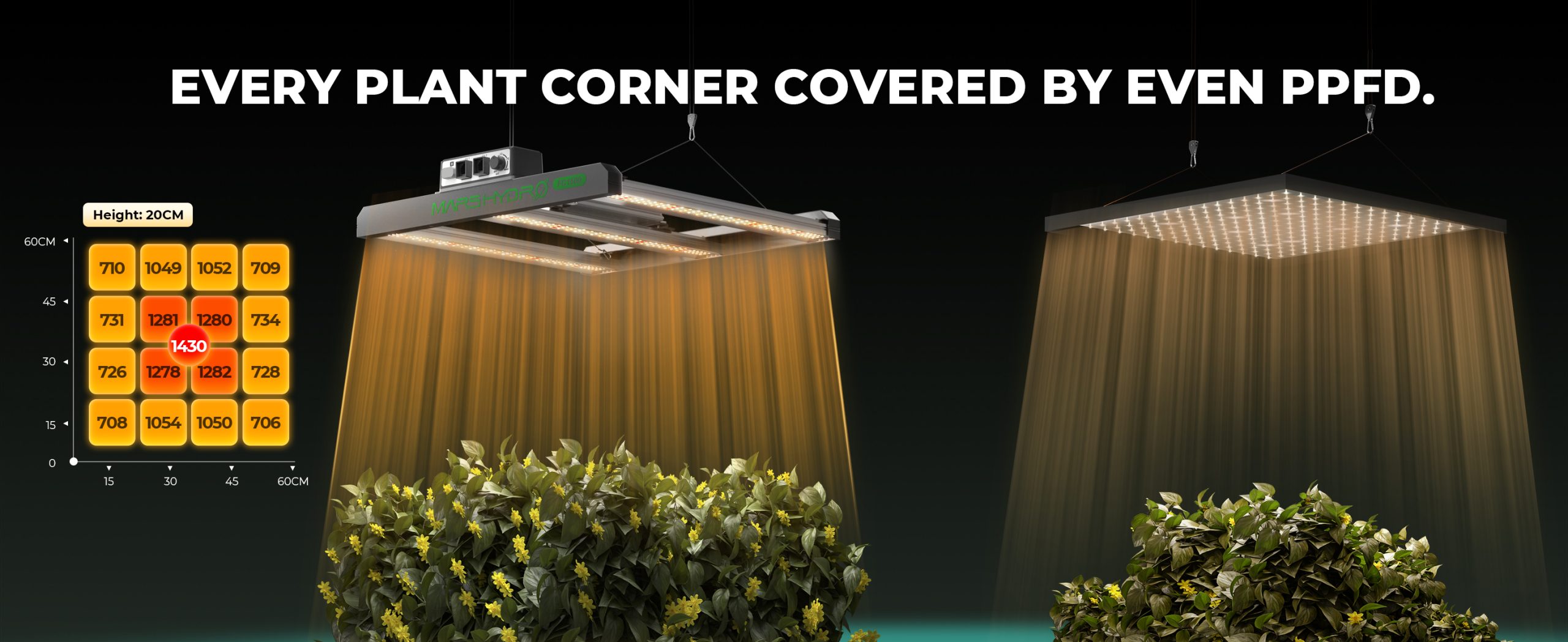 High PPFD and Even Light Distribution– The smart FC 1500-EVO provides an impressive PPF of up to 427 μmol/S, making it an excellent choice for growers and enhancing flowering to produce higher quality crops and greater yields. The LED chips on each light bar are arranged in a scientifically optimized pattern, resulting in even light distribution that promotes uniform plant growth while avoiding hotspots in the center.