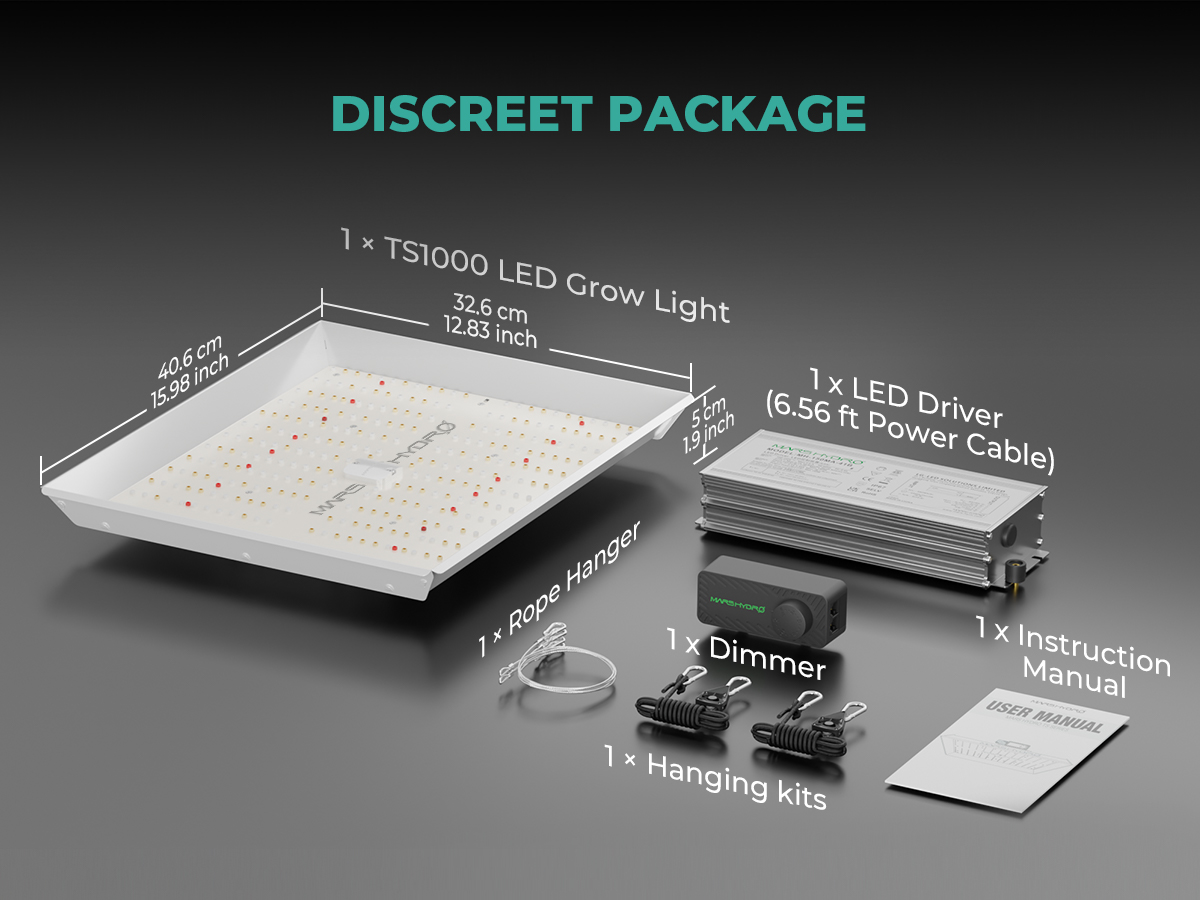 Consuming 150 watts and providing 343 umol/S of PPF, TS1000 LED grow light has the ability to replace a 250w HPS light, while reducing 40% power intake. *Match with 100x100cm grow tent , 4 inch fan with carbon filter kits