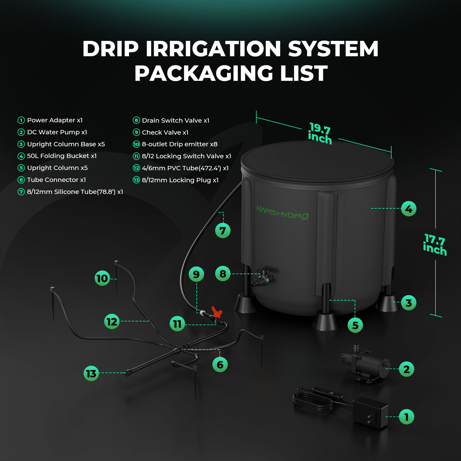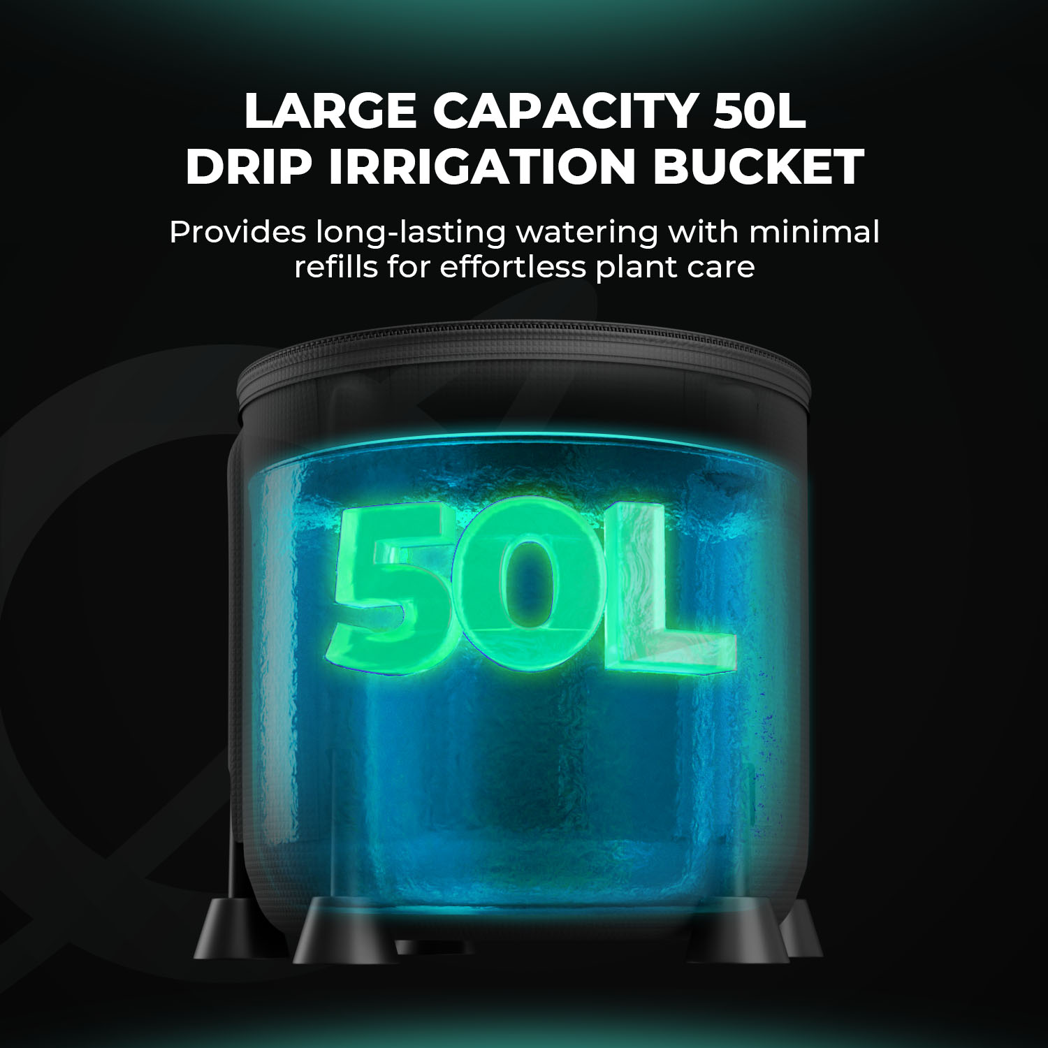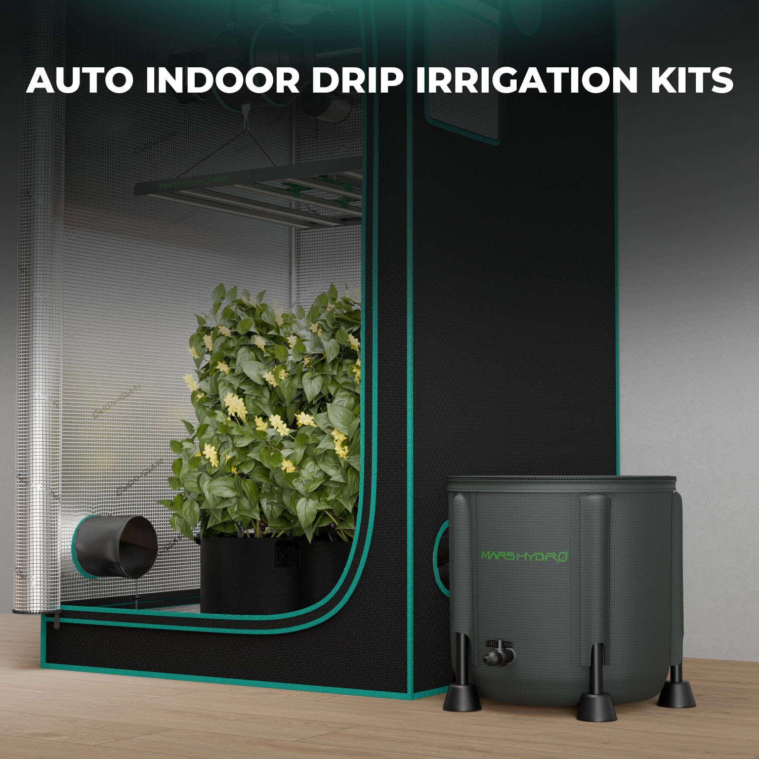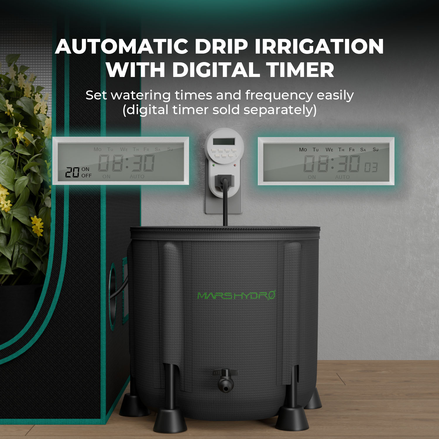 Experience convenience with the Mars Hydro 50L Foldable Bucket and 8-Irrigator Drip Kit combo, offering a complete, pressure-regulated watering system for your plants. Customize tubing length, position drip emitters, and enjoy year-round watering ease. Perfect for indoor grow tent systems.