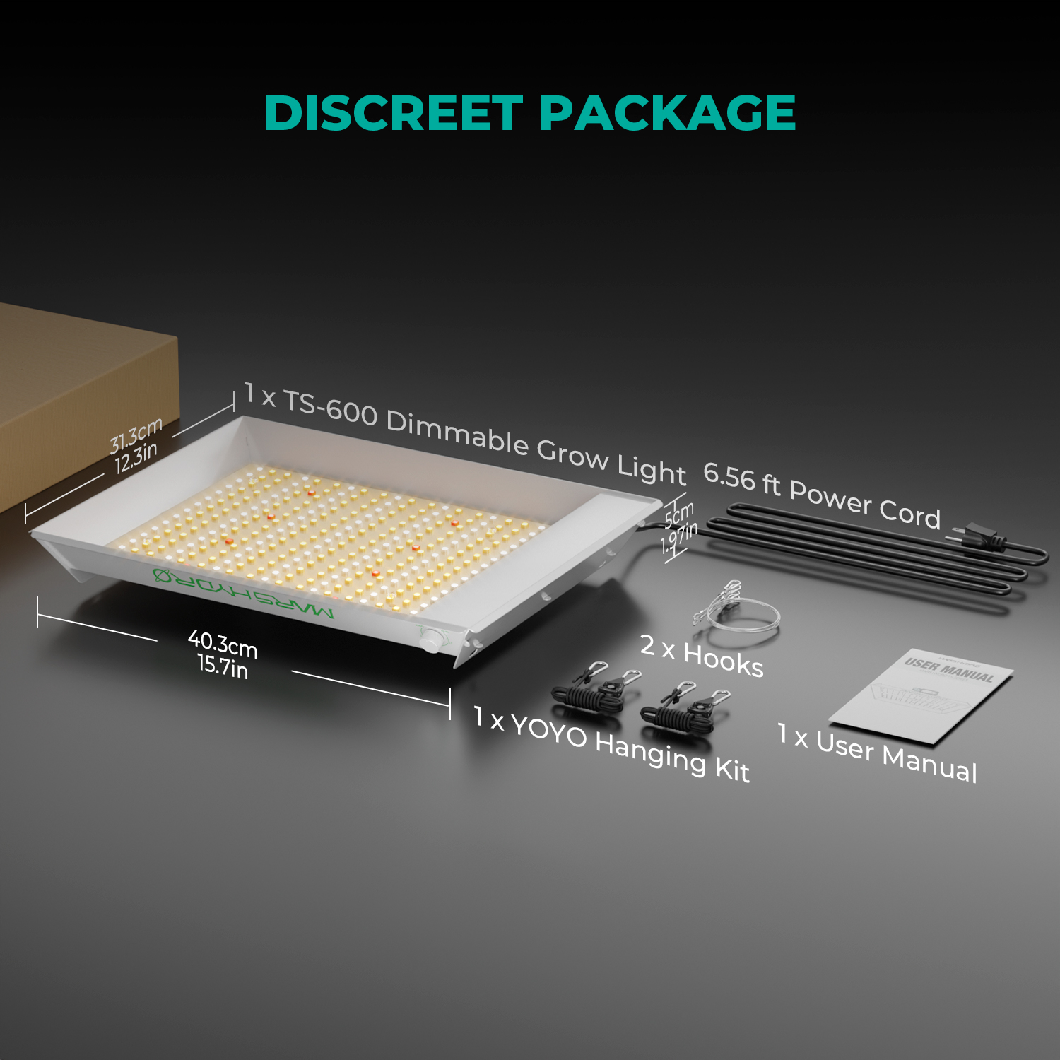 To add smart control features for "Inline Fan", please select the "iconnect smart controller" in "add-on". The most affordable complete grow tent kit, perfect for budget-conscious beginners. Designed for small-scale growing, it supports all grow stages for 1-2 plants or serves as a dedicated solution for the seedling stage. 【TS600 Grow Tent Kit Complete System Includes】Mars Hydro TS600 grow light, 60x60x140cm grow tent, 4"inline fan with speed controller, 4"carbon filter, 33ft length flex ducting, duct clamps,6.5" clip fan, grow room glasses,  elastic trellis net, 3 x grow bags, timer, humidity thermometer, pruning shears, corner shelf, rope hanger.