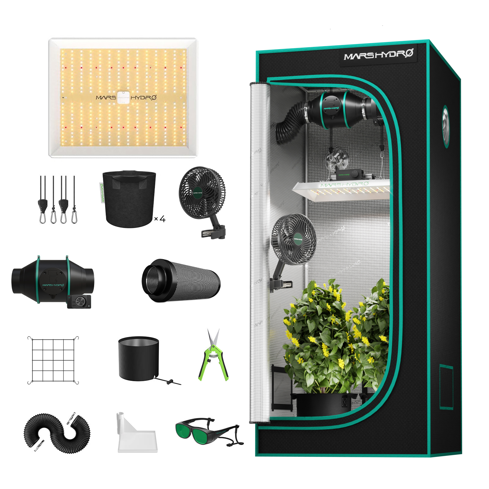 To add smart control features for "Inline Fan", please select the "iconnect smart controller" in "add-on". The most affordable complete grow tent kit, perfect for budget-conscious beginners. Designed for small-scale growing, it supports all grow stages for 1-2 plants or serves as a dedicated solution for the seedling stage. 【TS600 Grow Tent Kit Complete System Includes】Mars Hydro TS600 grow light, 60x60x140cm grow tent, 4"inline fan with speed controller, 4"carbon filter, 33ft length flex ducting, duct clamps,6.5" clip fan, grow room glasses,  elastic trellis net, 3 x grow bags, pruning shears, corner shelf, rope hanger.